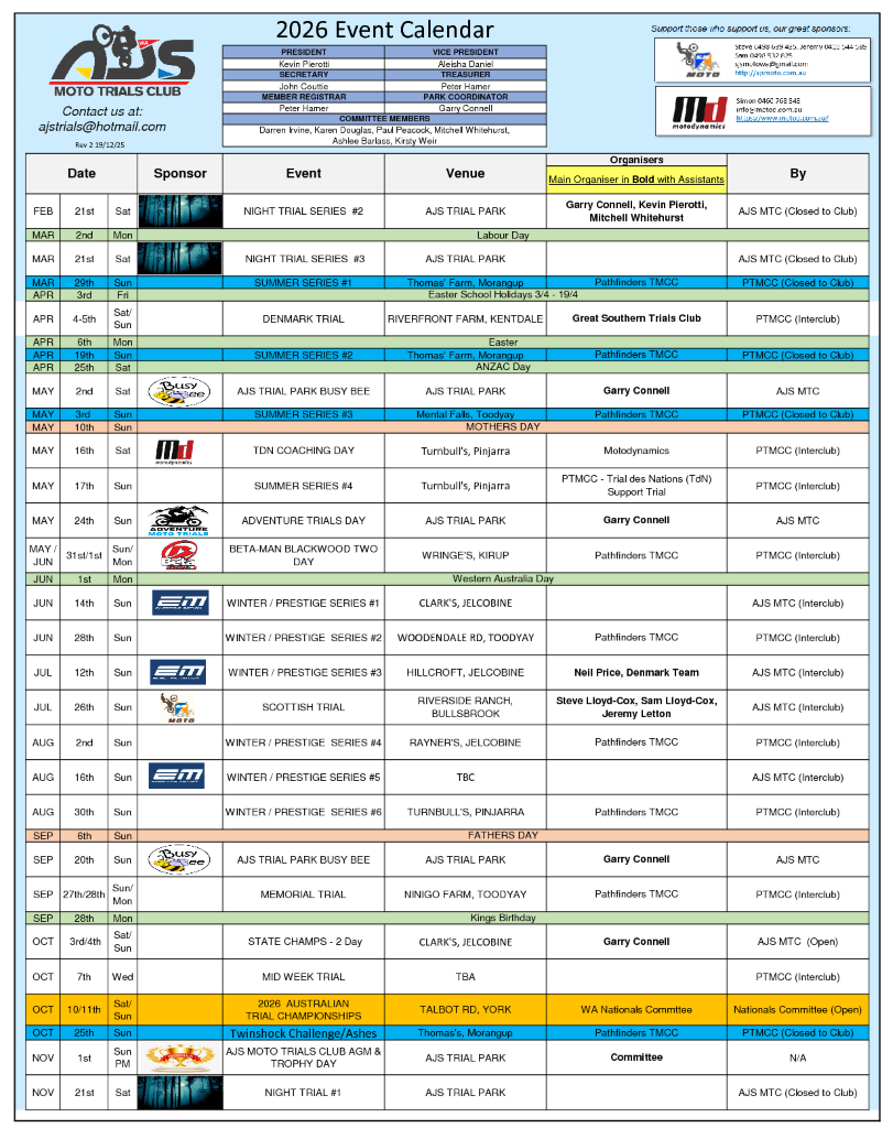 The 2026 AJS MotoTrials Calendar is now available and can be downloaded from the Home Page or direct from this link. See the full calendar as an image above for a quick reference. But best to download (Right Click the link to Save Link As .. a pdf), print and pin it up on your wall.